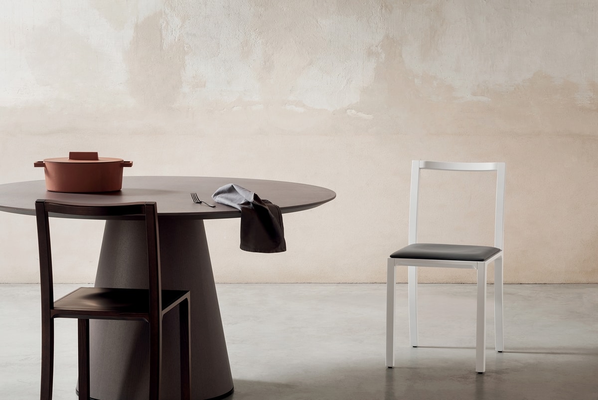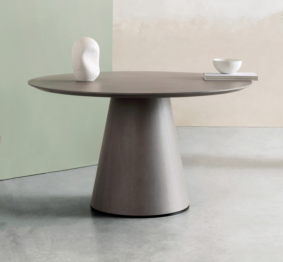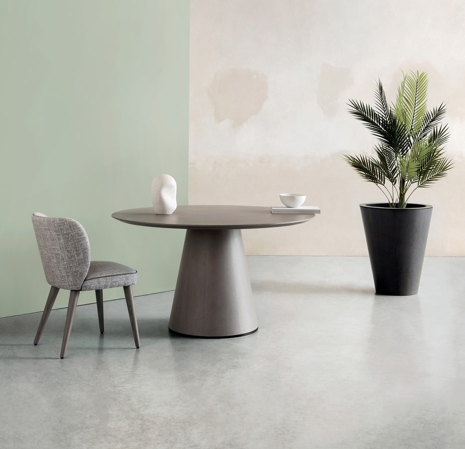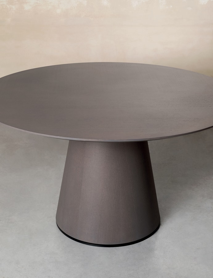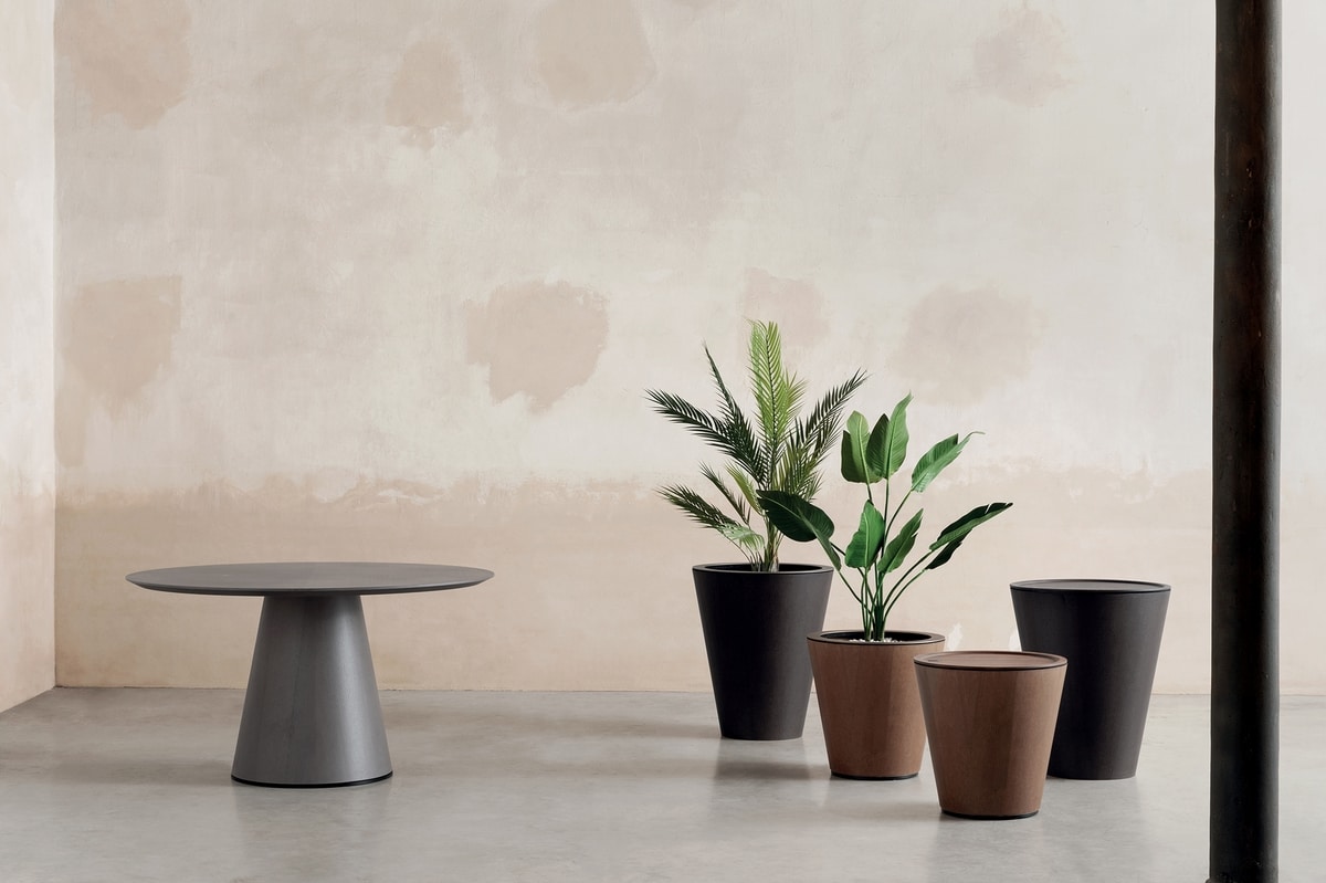 La collezione Kono presenta un design unico per il concetto di spazio dining e living, attraverso la curvatura del legno di frassino. Il tronco di cono è il focus creativo del progetto e diviene base a colonna per il tavolo da pranzo e corpo, se girato di 180°, per tavolini e fioriere per piante artificiali. Disponibile in due diverse altezze, si adatta come elemento funzionale e decorativo in qualsiasi esigenza abitativa.