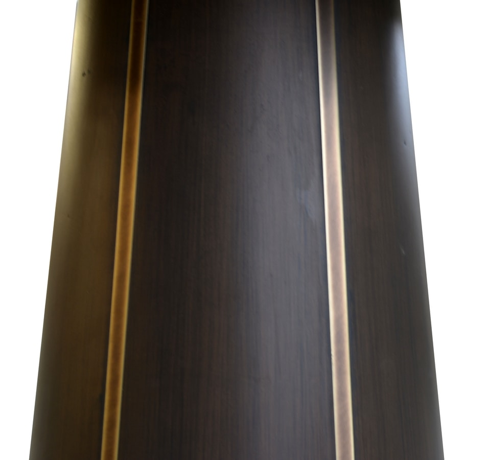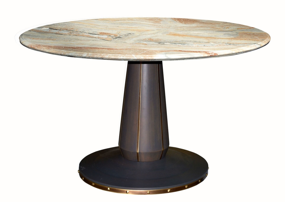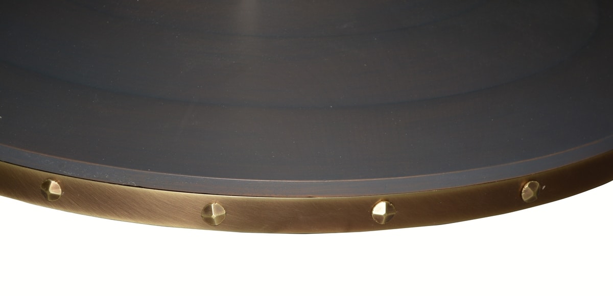 Tavolo rotondo in noce con gambone centrale e base impreziositi da ottone brunito a mano e borchie.