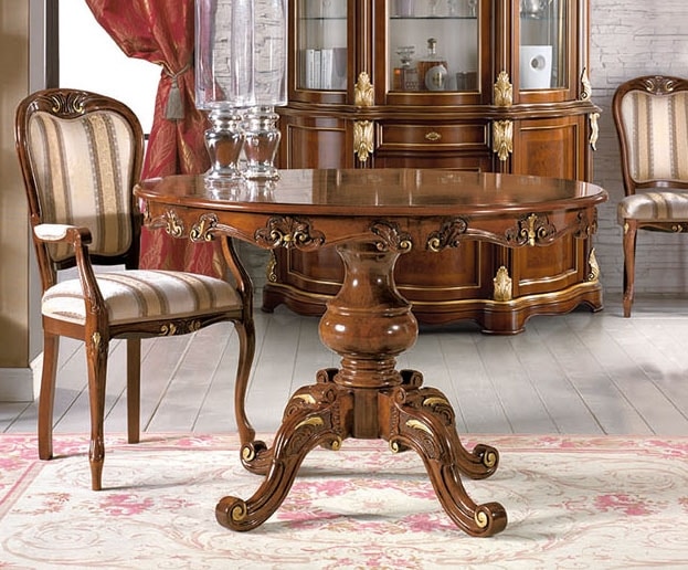 Tavolo tondo con piano allungabile. Ideale per sale da pranzo in stile classico.