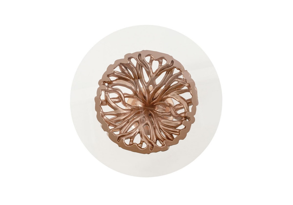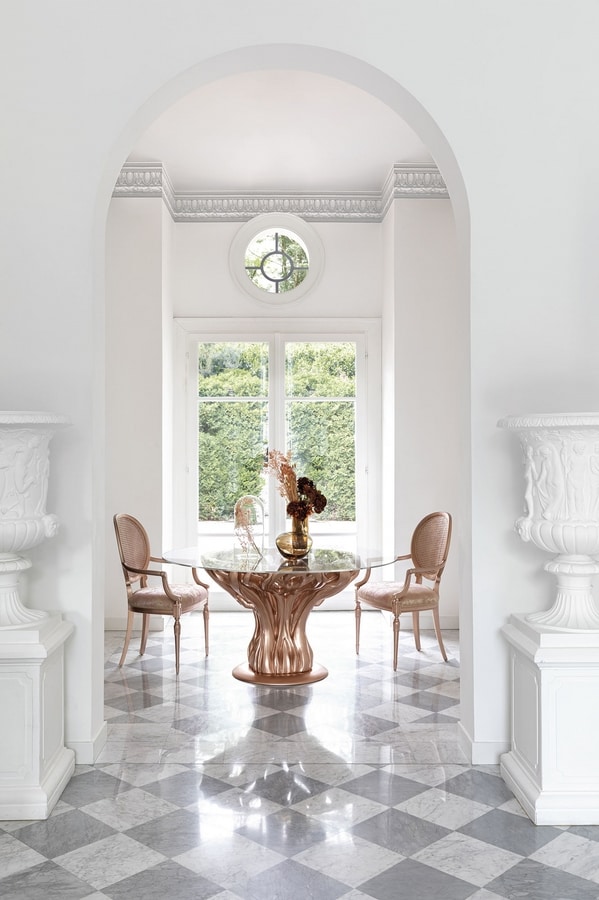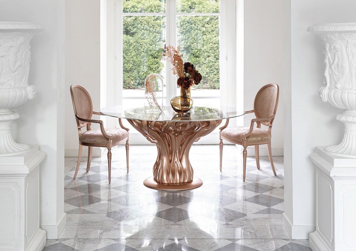 Tavolo rotondo intagliato in massello di tiglio, finitura laccata colore sakura con effetto metallizzato opaco, piano in cristallo trasparente.