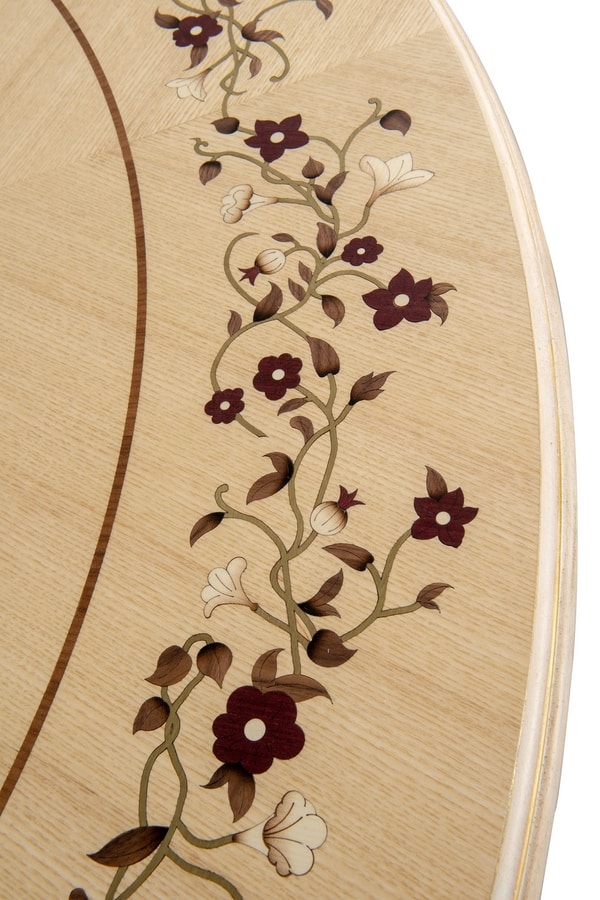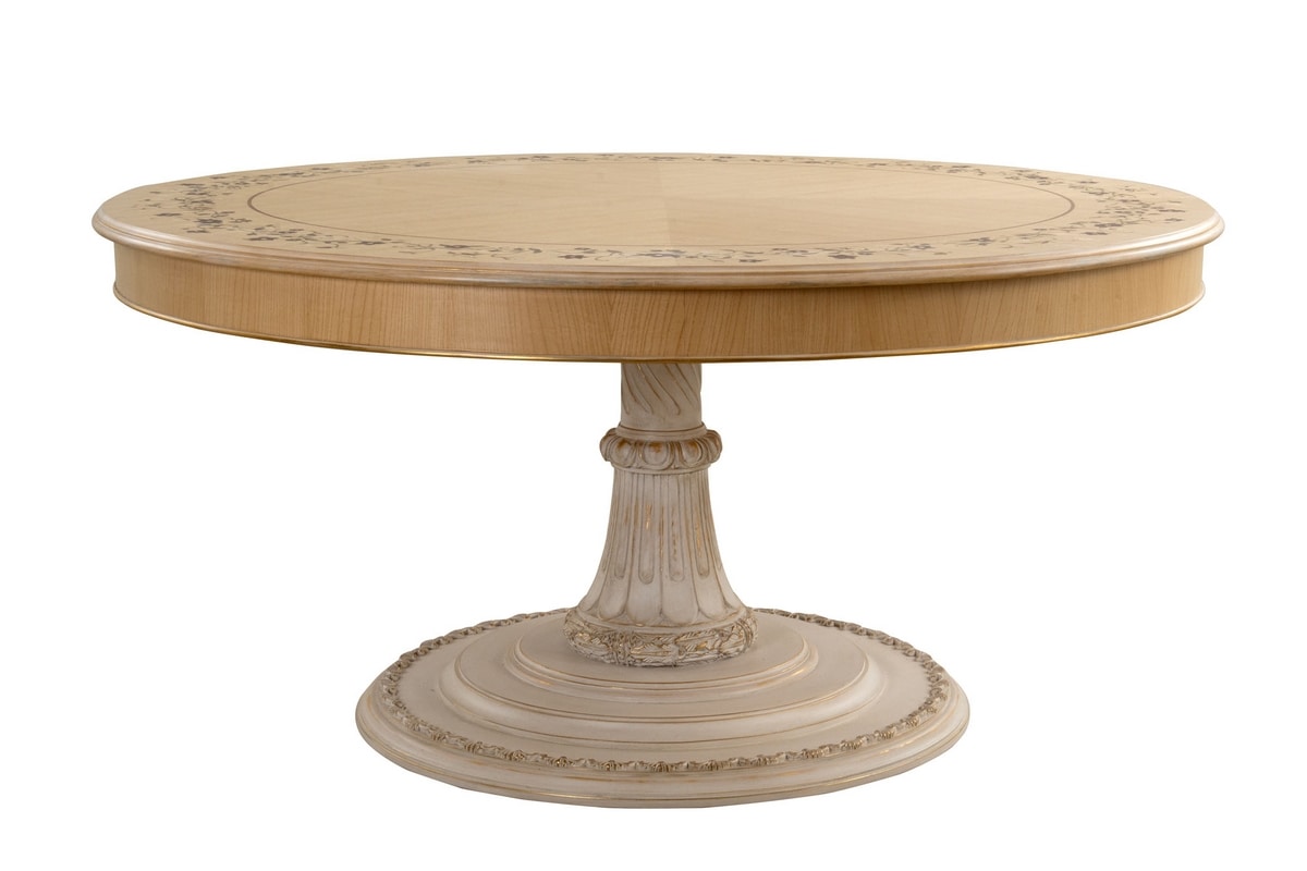 Tavolo da pranzo con piano con fondo in frassino intarsiato: filetto in noce canaletto, fiori scuri in amaranto, fiori chiari in acero, foglie in noce canaletto sfumato, base con finitura LAFM laccato spelato tempera francese colore bianco meringa fondo oro foglia.