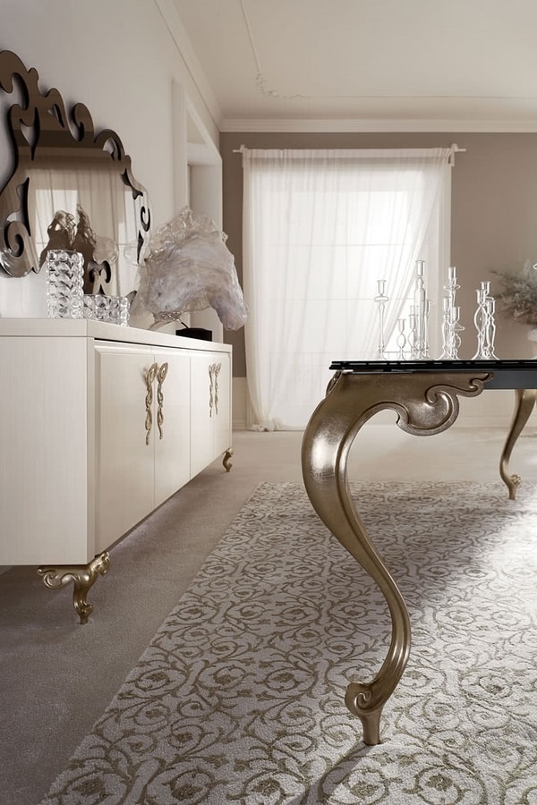 Il top può essere realizzato in marmo, sagomato e levigato, o in vetro bronzato fumè, accoppiato ad uno specchio bronzato a doppia argentatura, con profili sagomati. I piedi sono levigati manualmente.