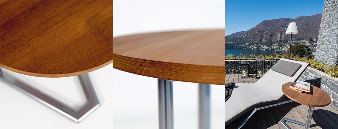 Tavolino dal design moderno, essenziale e minimalista realizzato in acciaio verniciato impreziosito da pianale in legno Iroko, Teck, Hpl, Cristallo.