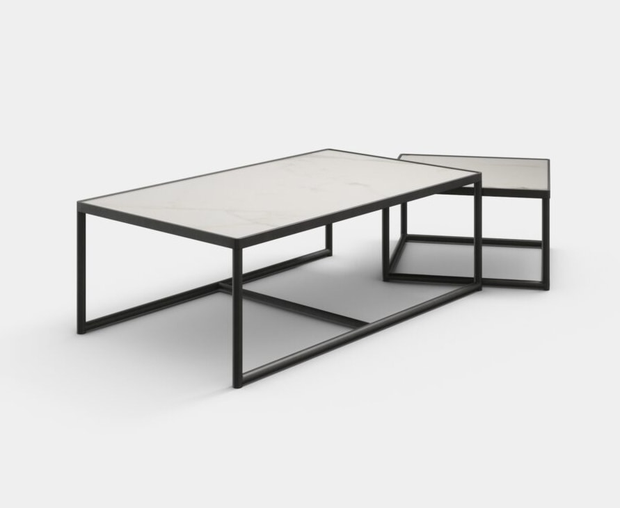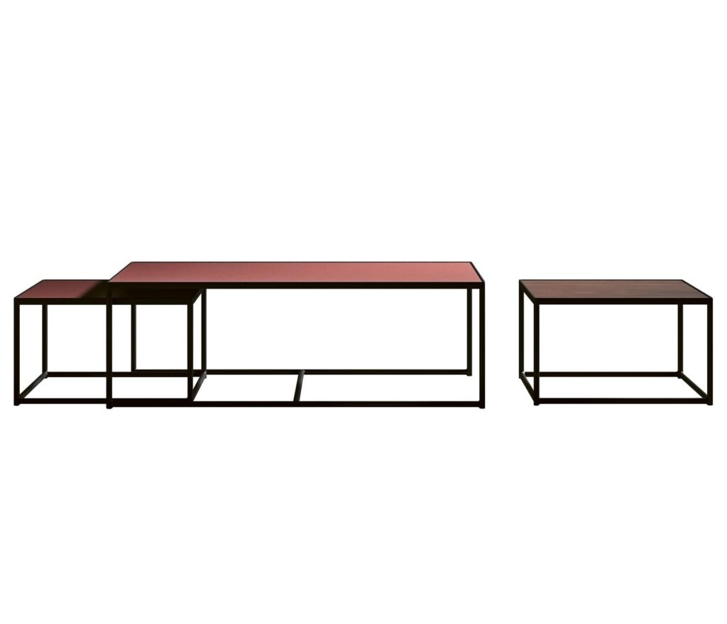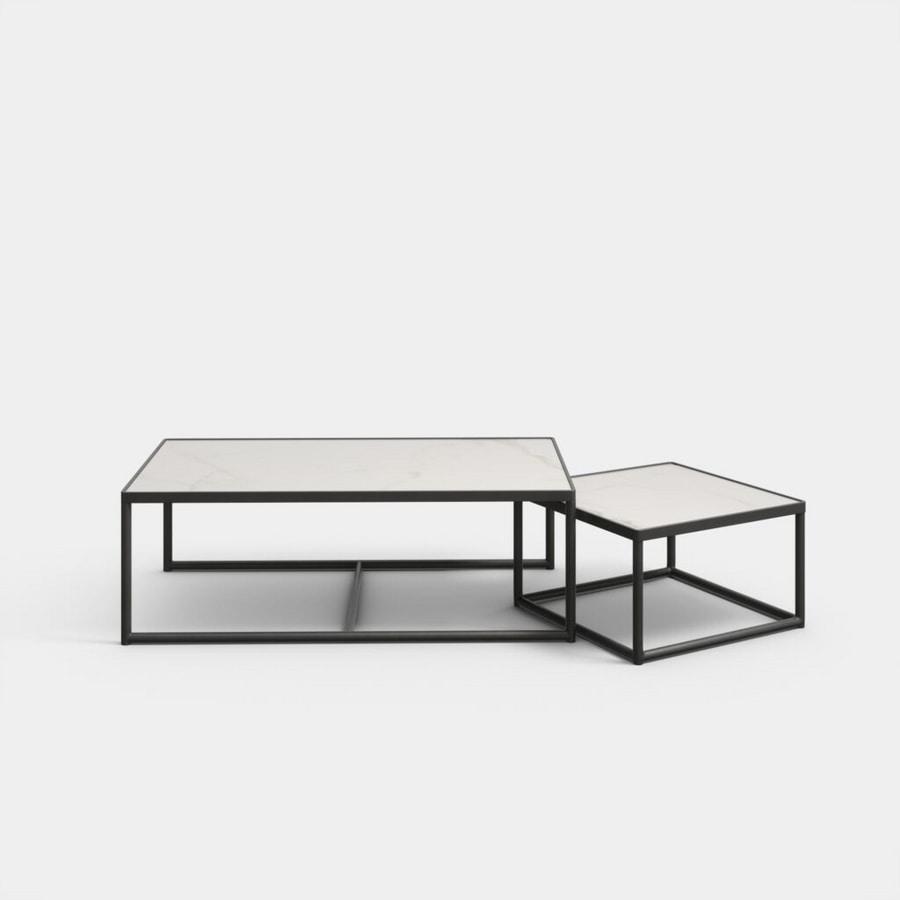 Tavolino componibile, costituito da tre elementi indipendenti di cui uno centrale, dalle dimensioni maggiori, e due laterali più piccoli. Struttura in metallo verniciato e piano in diversi materiali e finiture. Top a filo con struttura metallica.