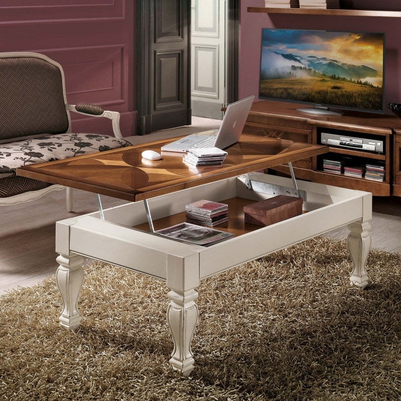 Gambe a balaustra con fascia sottopiano liscia. Piano intarsiato con motivo a quadrifoglio. Il piano può alzarsi per permettere di lavorare al computer, scrivere o mangiare stando comodamente seduti in divano.