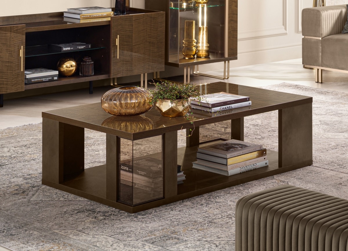 Le geometrie sobrie e pulite sono impreziosite dalla finitura in sicomoro noce high-gloss che contraddistingue le superfici, rendendole luminose e profonde e regalando raffinati giochi di riflessi.