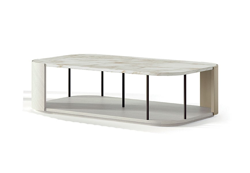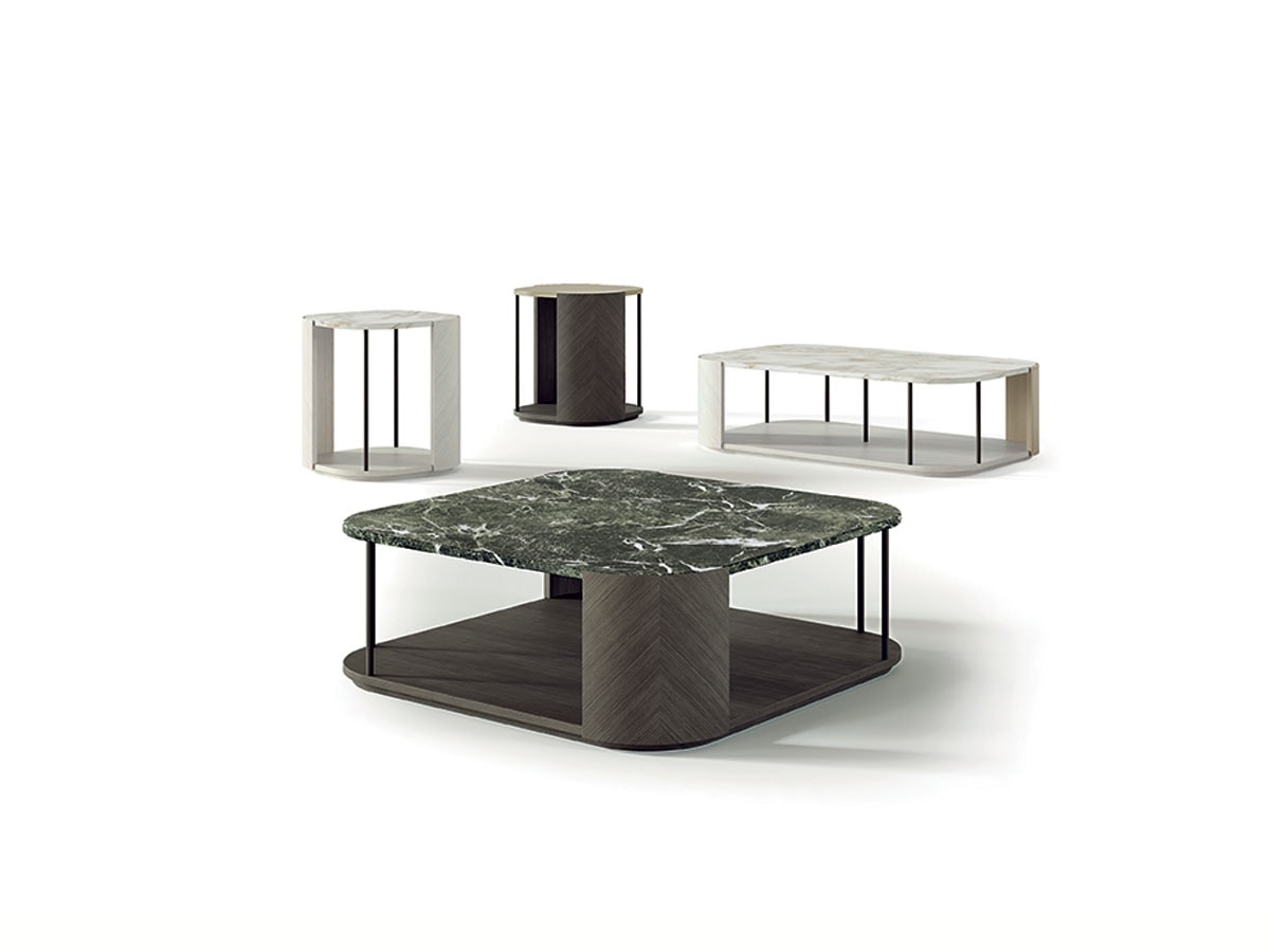 Serie di tavolini ispirati alla libreria Gae caratterizzati da elementi curvi disponibili in Tay chiaro, Tay scuro, Noce Canaletto e cuoio. Il top è disponibile in diverse tipologie di marmo, legno e cuoio. Supporti in metallo disponibili in finitura bronzo-oro, piombo e brunito.