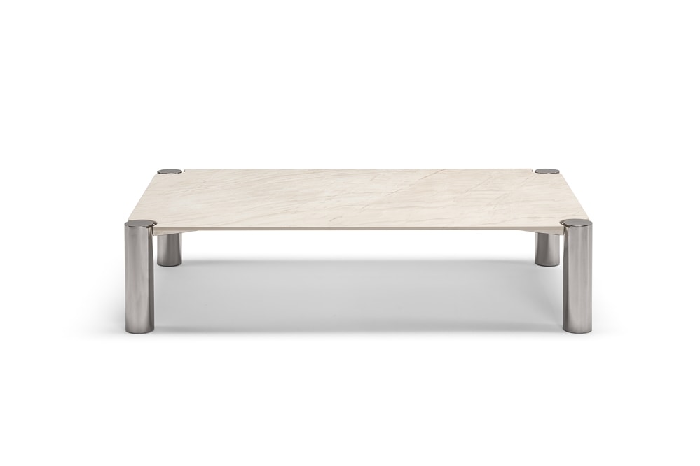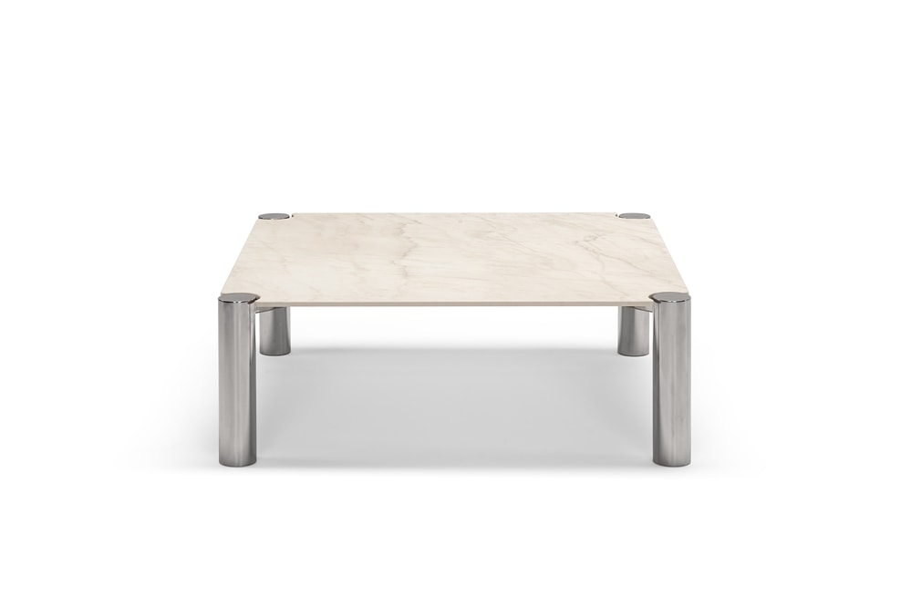 Con la sua estetica che gioca con abbinamenti cromatici e materici, il duo di coffee table Vision è l’ideale complemento per un arredamento dal mood minimale, versatile e al contempo espressione di convivialità. Risultato della sapiente composizione di un ripiano in gres all’interno del quale trovano alloggio piedini tubolari in metallo, il tavolino Vision è disponibile nella variante quadrata o rettangolare. Ampia la possibilità di personalizzare le finiture del ripiano – disponibile in tre lavorazioni differenti – e dei piedini – proposti in quattro diverse finiture: lucida, cromata, titanio o ferro calamina.