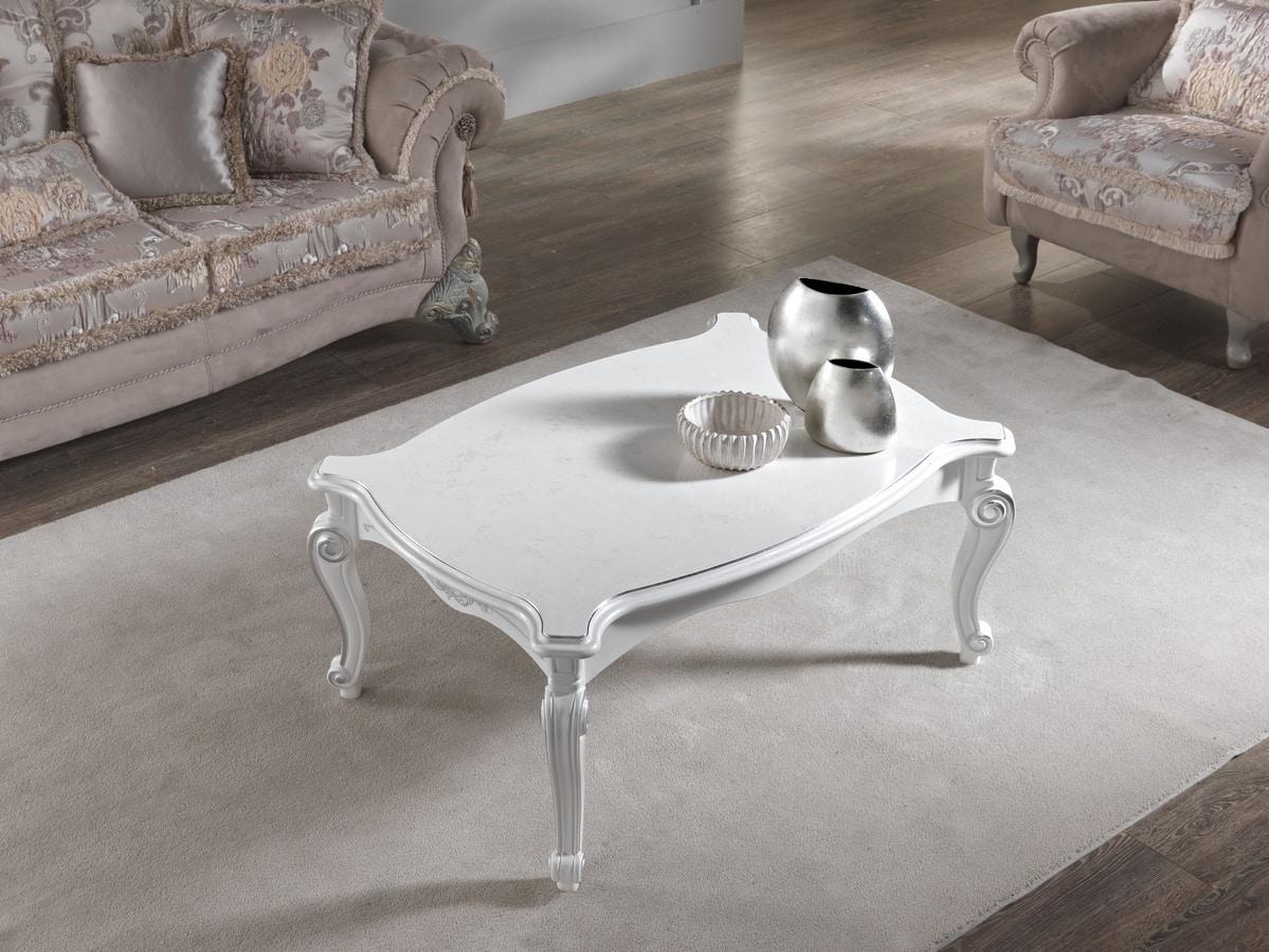 Tavolo Chanel da salotto con decori e particolari in foglia argento seguiti a mano.