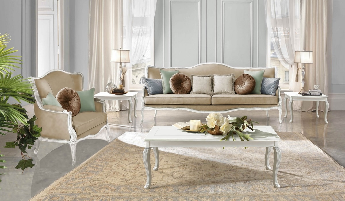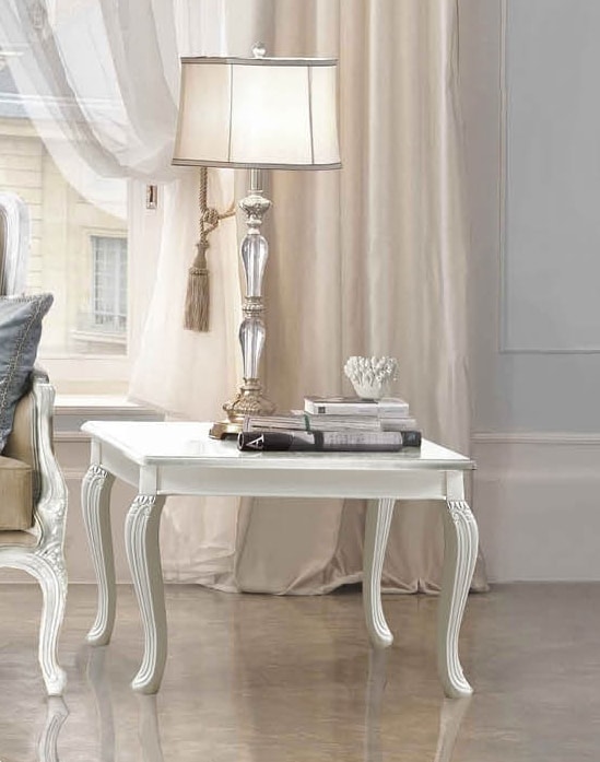 Tavolino quadrato in stile classico, con struttura in legno intagliato e piano intarsiato.