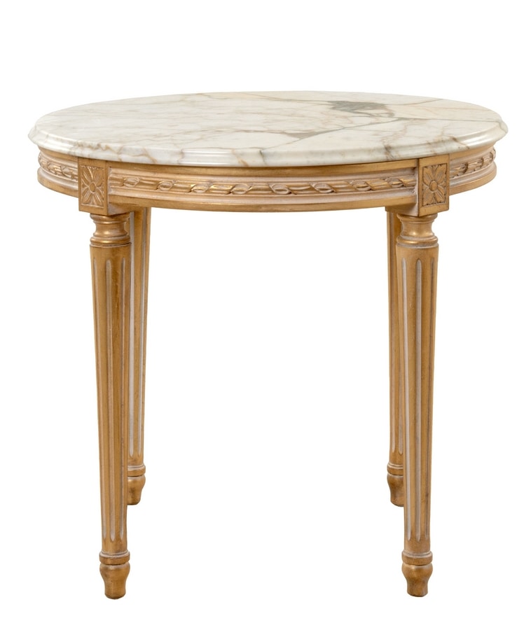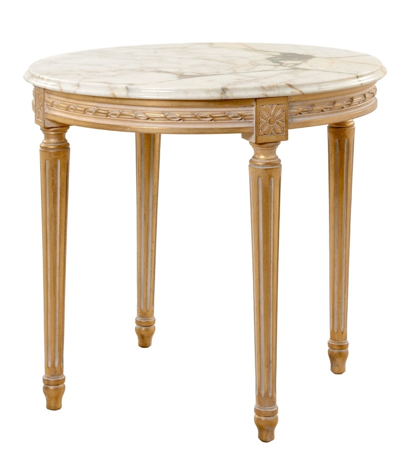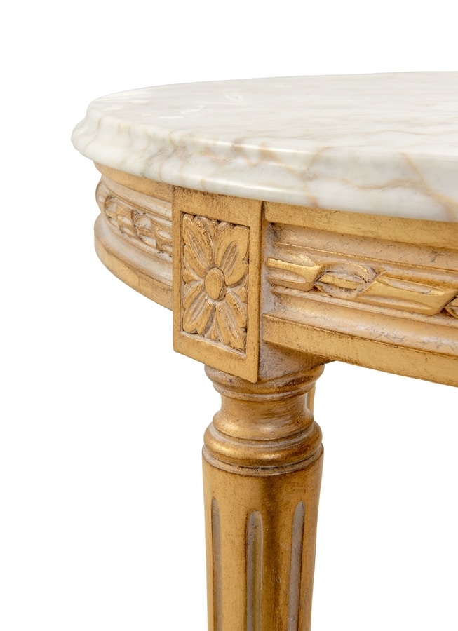 Tavolino laterale con piano marmo Calacatta Oro, base intagliata in legno con finitura OCH oro foglia patinato bianco meringa (Oro Chic).
