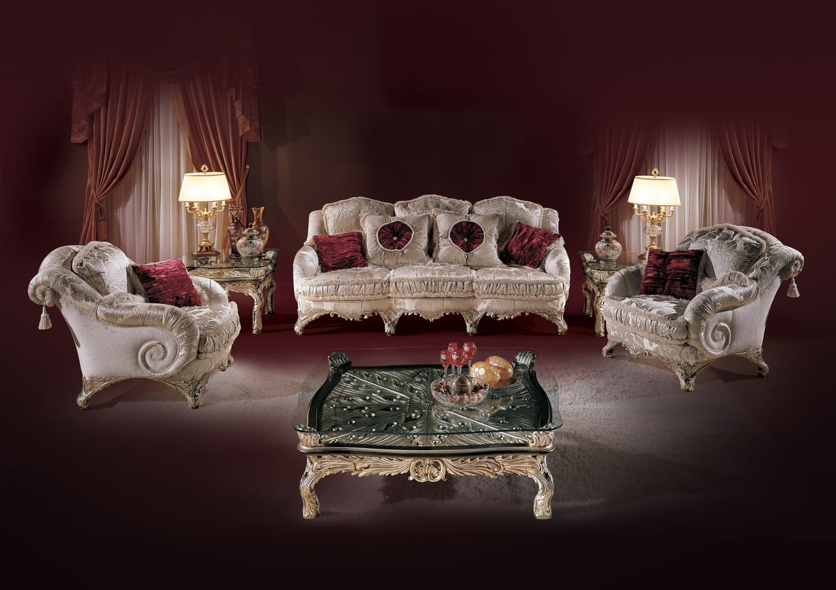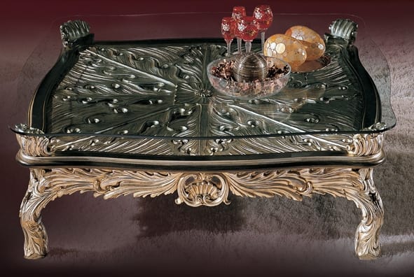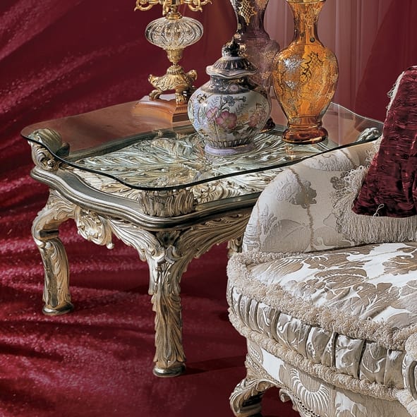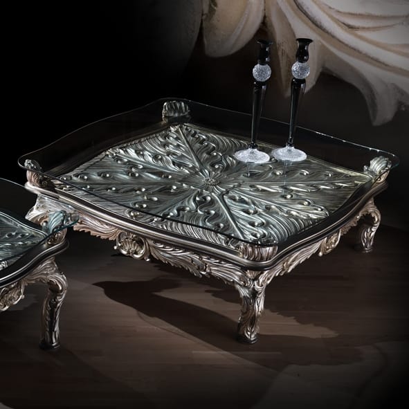 Tavolino di lusso con intagli in finitura argento. Sia sulla base ma anche sul piano il tavolino è completamente intagliato e sovrastato da un altro piano in cristallo che ne rende visibile la sapiente lavorazione del legno. Accompagna un salotto classico con basamento che ne riprende l'intaglio . Possibilità di altre finiture.