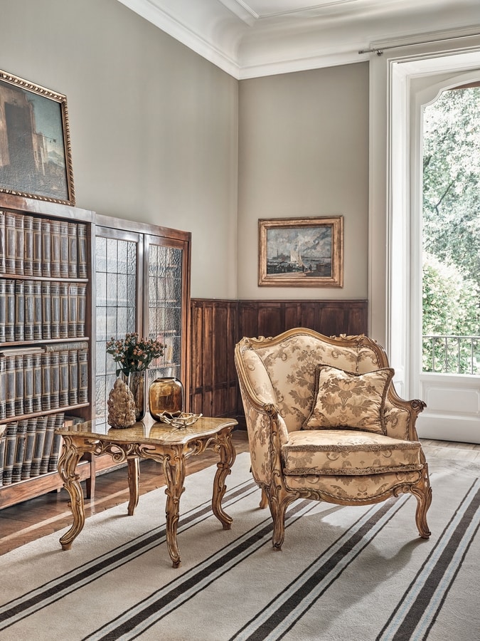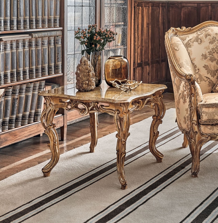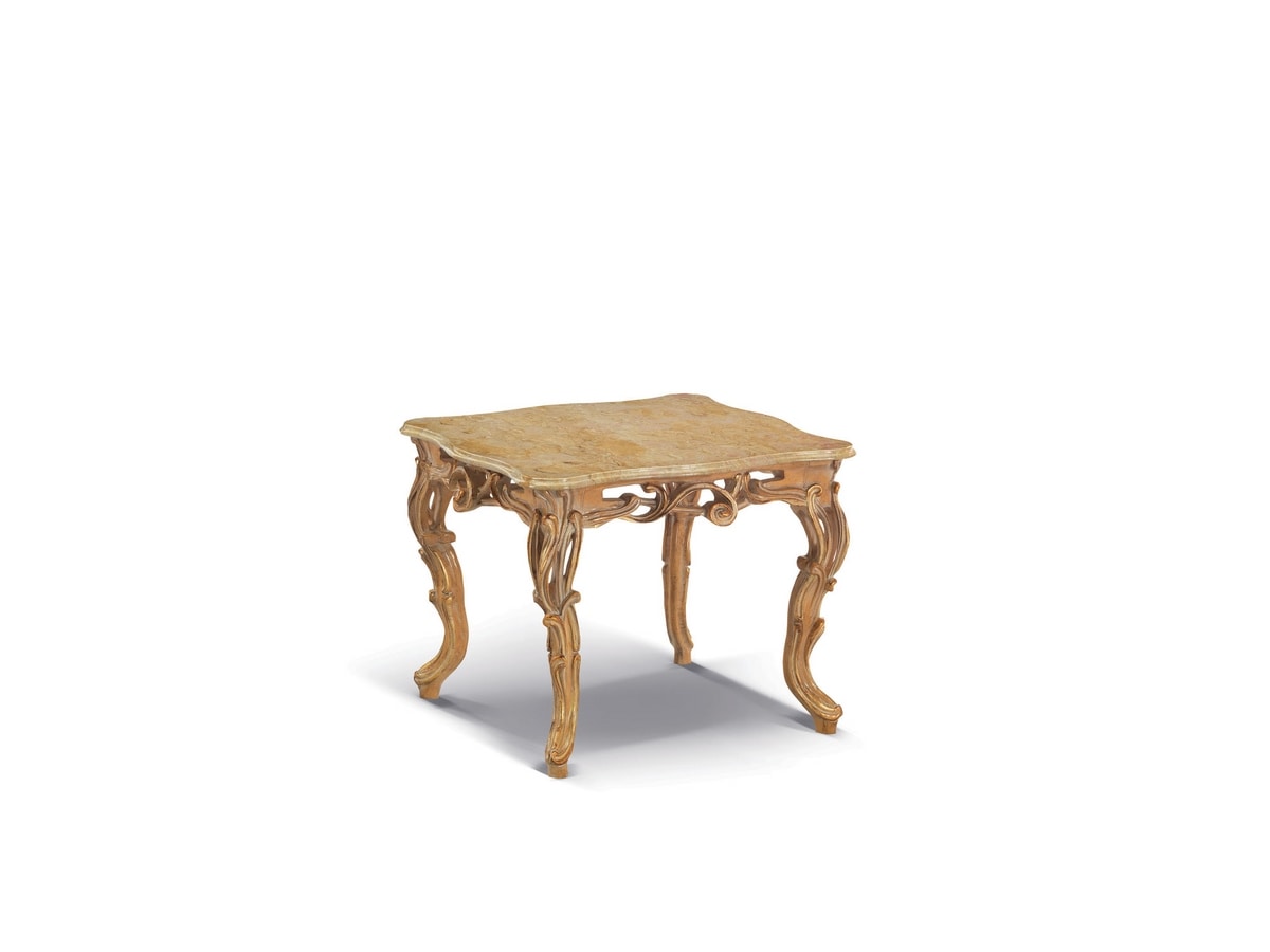 Elegante e raffinato tavolino da salotto, destinato ad una casa esclusiva e di classe. Gambe intagliate, top con marmo prezioso. Questa tavolino può essere inserito all’interno di un arredamento classico oppure in un contesto moderno, come forte elemento di contrasto.