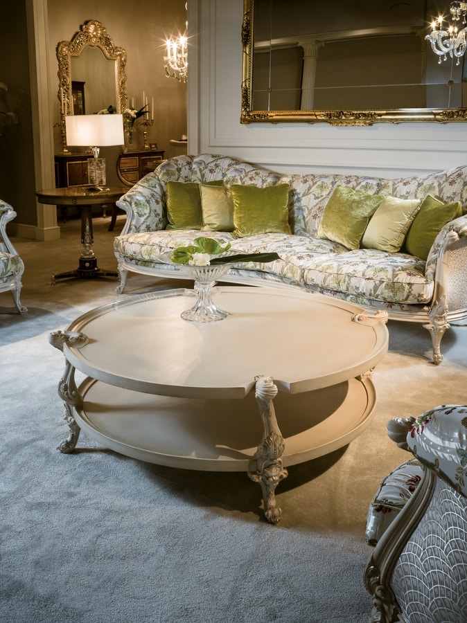 Tavolino stile classico finitura laccata e lucidata con colori policromi e argento e patinatura finale. Possibilità di altre finiture. I due piani in legno sono uniti da gambe sapientemente intagliate a mano. É accompagnato dal tavolino laterale con dimensioni più piccole. Con le nostre collezioni di salotti classici di lusso possiamo arredare la zona relax della casa e renderla accogliente, mantenendo l’eleganza rappresentata dai vari stili e fe finiture ricercate.