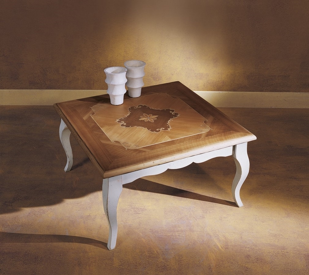 Tavolino in stile '700, con gambe in legno laccato bianco e piano quadrato intarsiato.