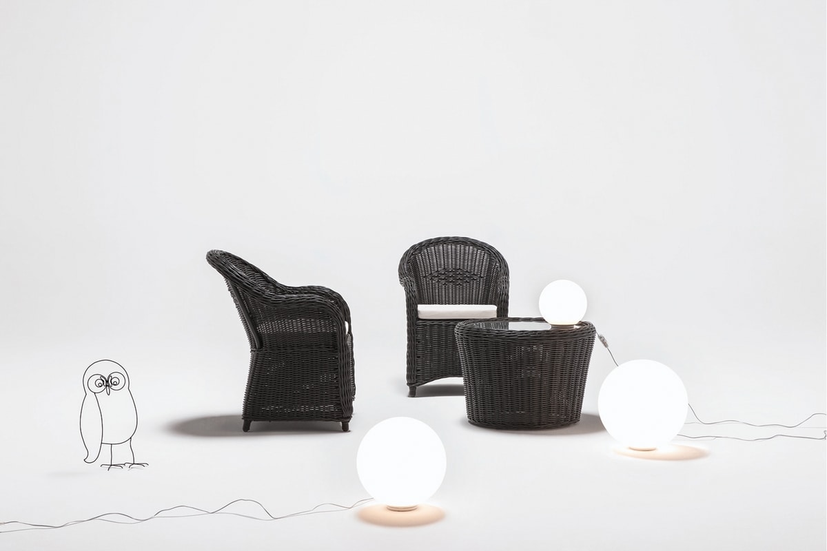 Il tavolo basso rotondo è realizzato con fibra intrecciata Core XL a sezione rotonda da 6 millimetri di diametro, intrecciata a mano su una struttura in tubolare di alluminio. A differenza del vimini naturale questo materiale non ammuffisce, non imputridisce, non si sporca facilemente e non ha bisogno di essere riverniciato perché al momento dell’estrusione vengono aggiunti degli additivi che ne garantiscono la resistenza e l’elasticità. I piedini antigraffio sono in Teflon e il vetro trasparente per il piano è incluso.