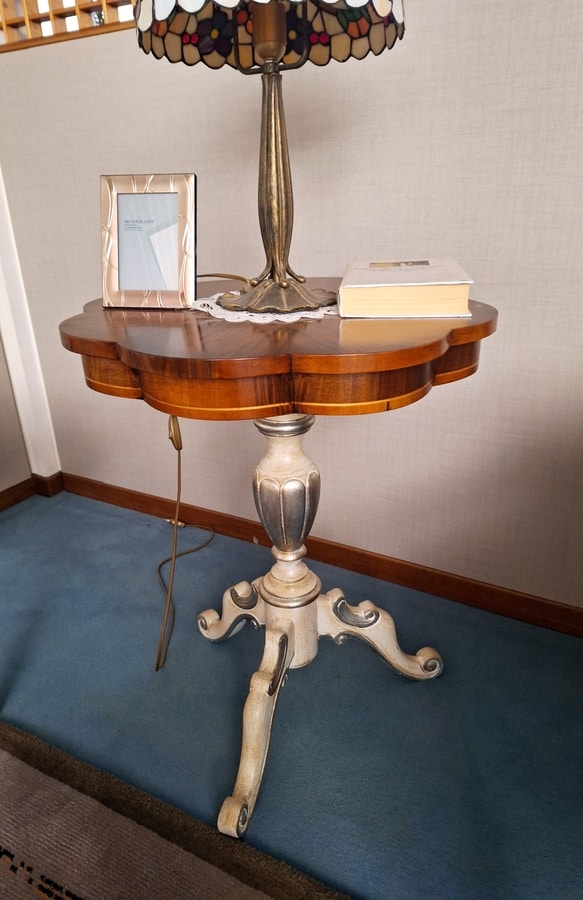 Tavolino con top in noce a forma di fiore, con base laccata bianco patinato e profili foglia argento.