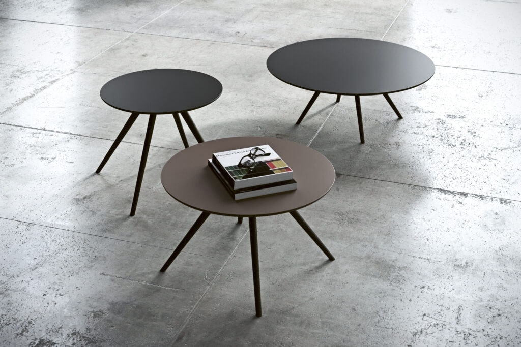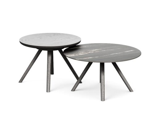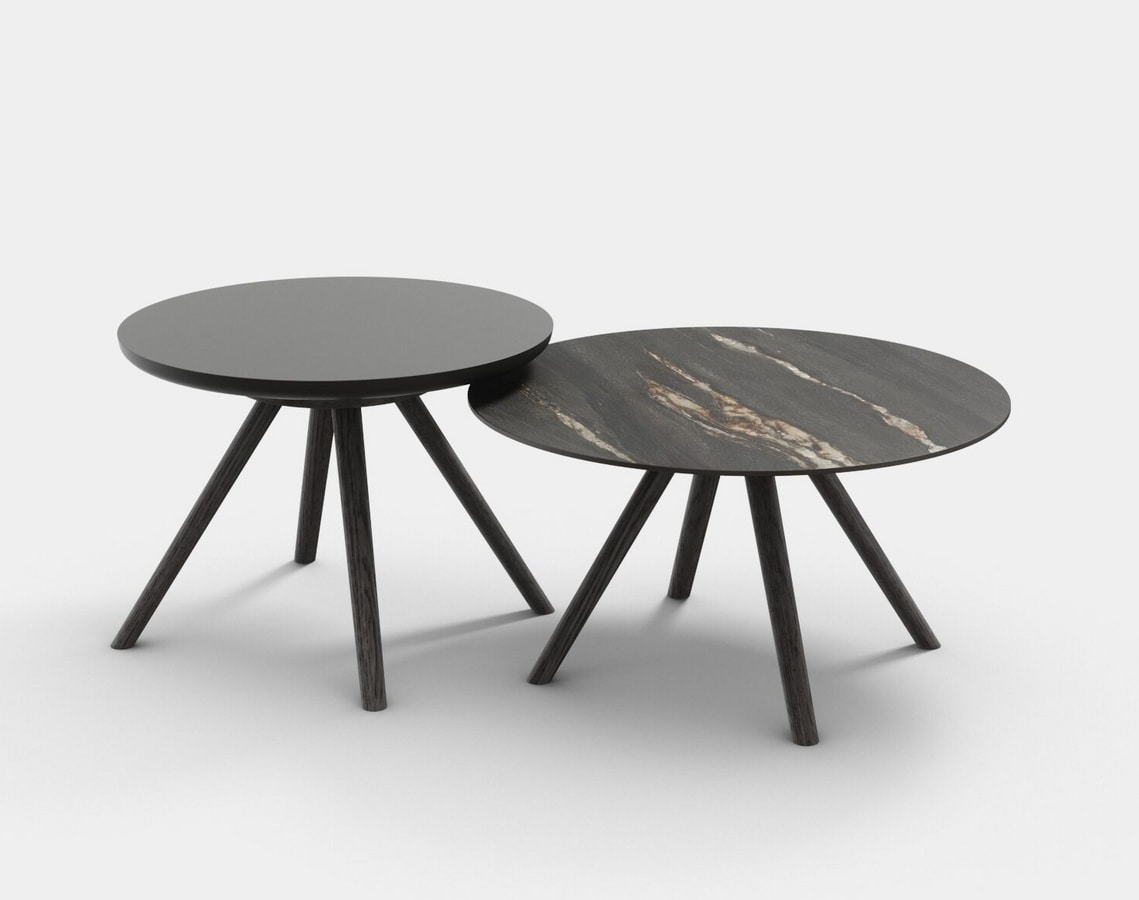 Tavolini disponibili nelle altezze 30, 35, 40 cm e nei diametri 50, 60, 80 cm e possono essere combinati tra loro. Struttura in legno massello di rovere in finiture diverse, piani realizzabili in legno, fenix, hpl o ceramica.