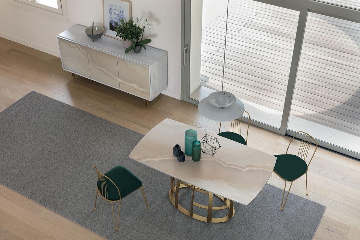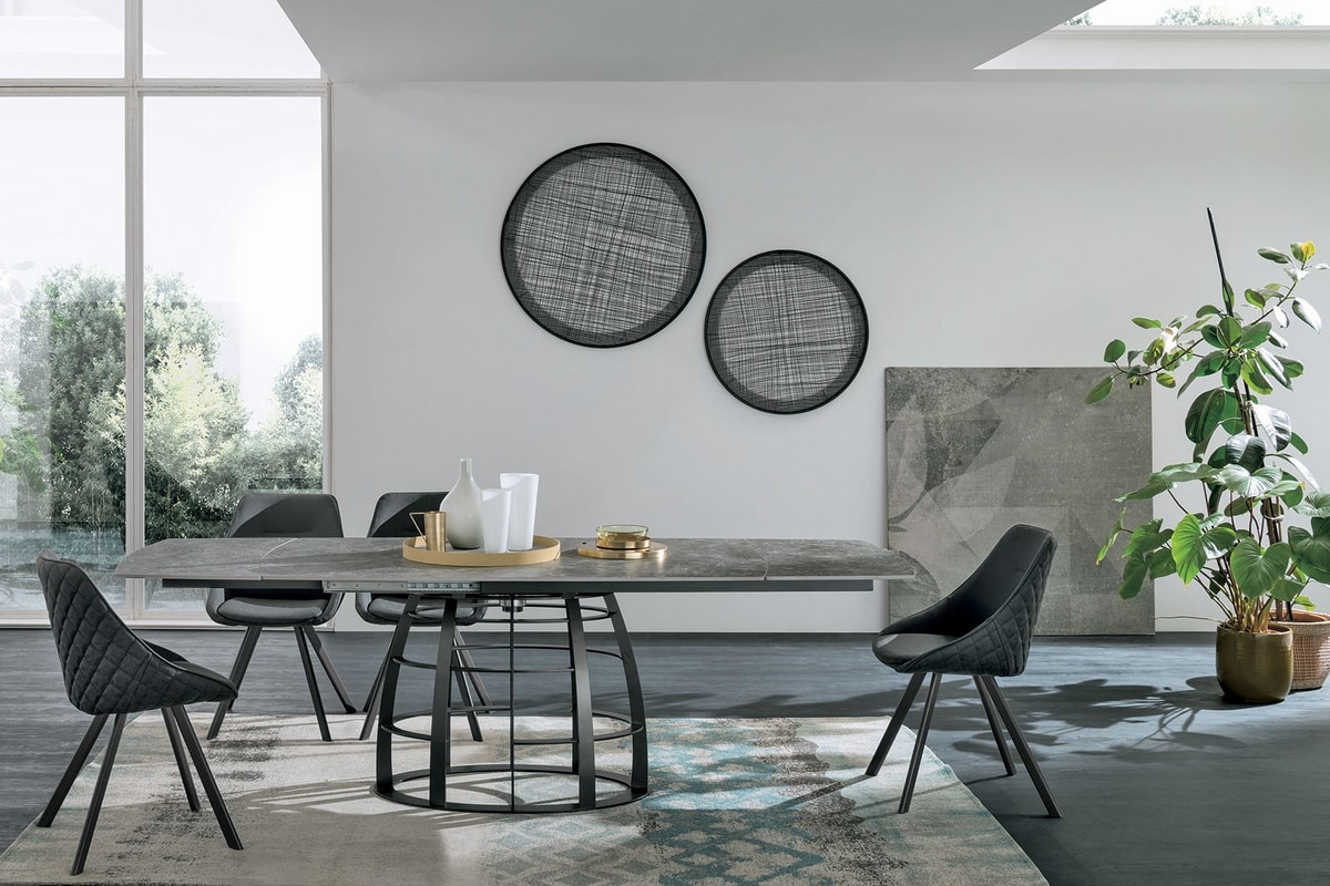Tavolo allungabile con basamento in metallo. Piano girevole semiautomatico e allunghe laterali a botticella in gres porcellanato o in vetro temperato con stampa digitale.