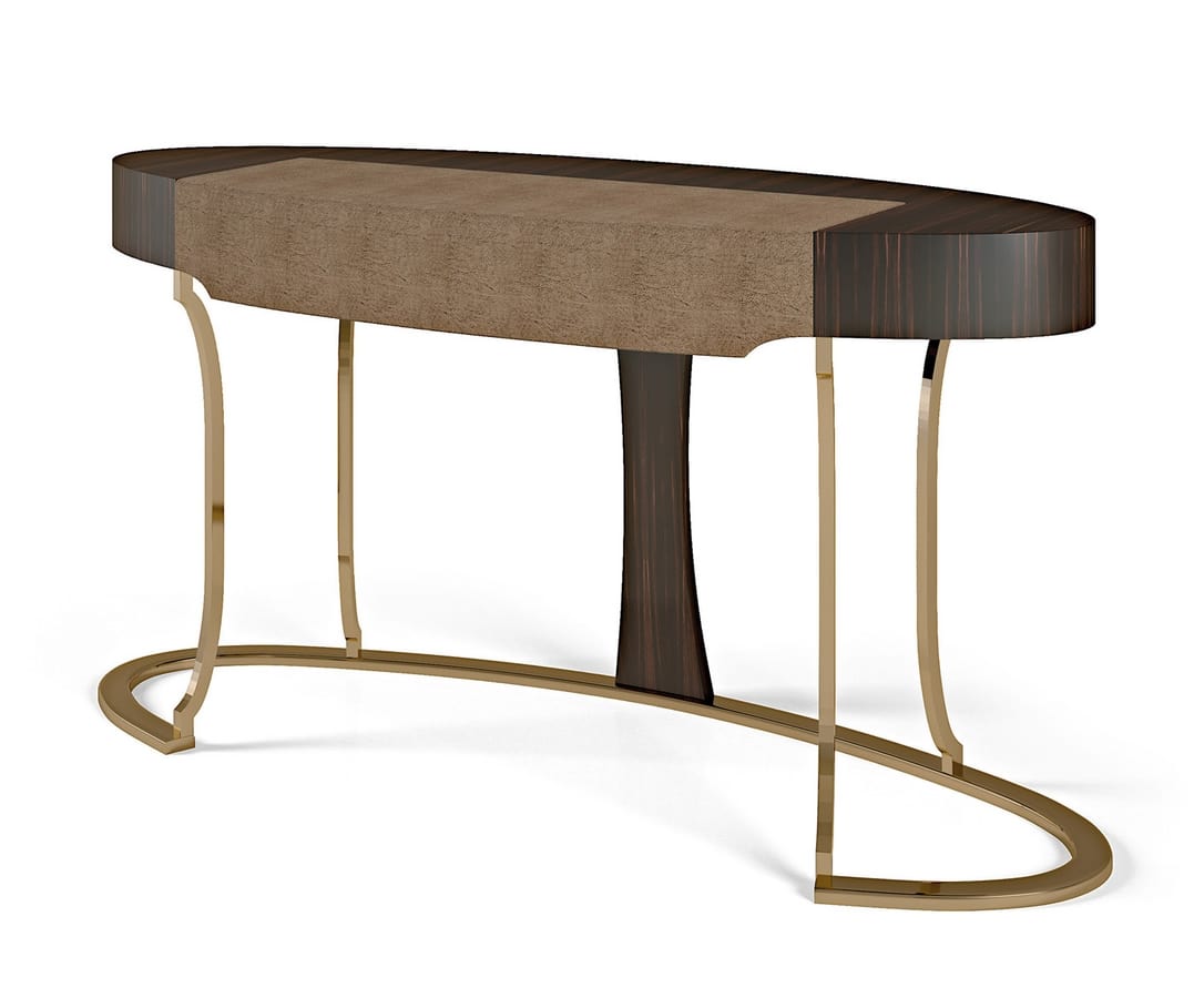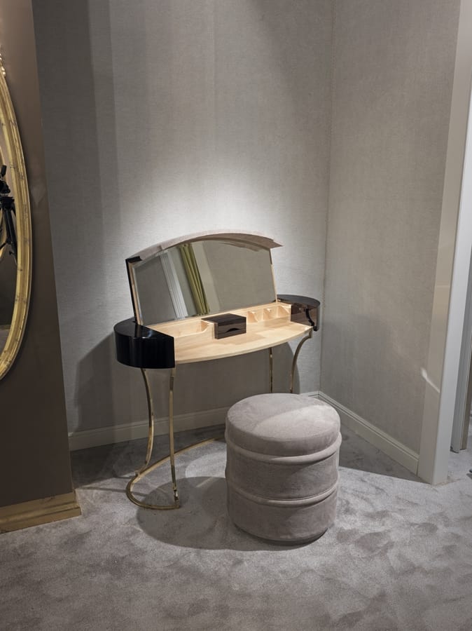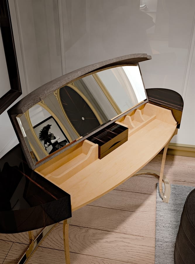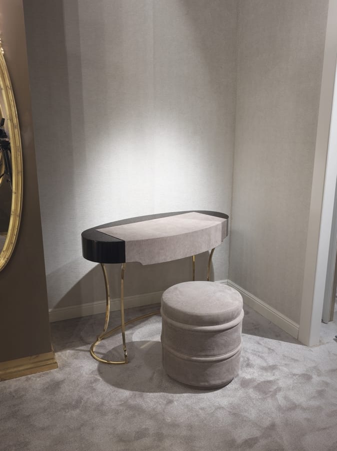 La toilette della camera da letto Hotel de Ville riprende la forma ed i materiali dei comodini. La struttura in ebano lucido racchiude un vano portaoggetti con specchio, che all'esterno è rivestito in nabuk richiamendo i materiali del letto e degli altri arredi. La base è in ottone lucido. Materiali di pregio che caratterizzano tutti gli arredi della camera da letto.