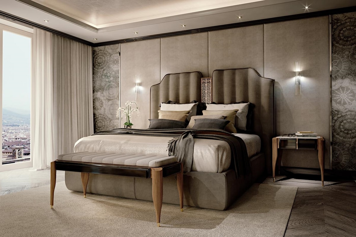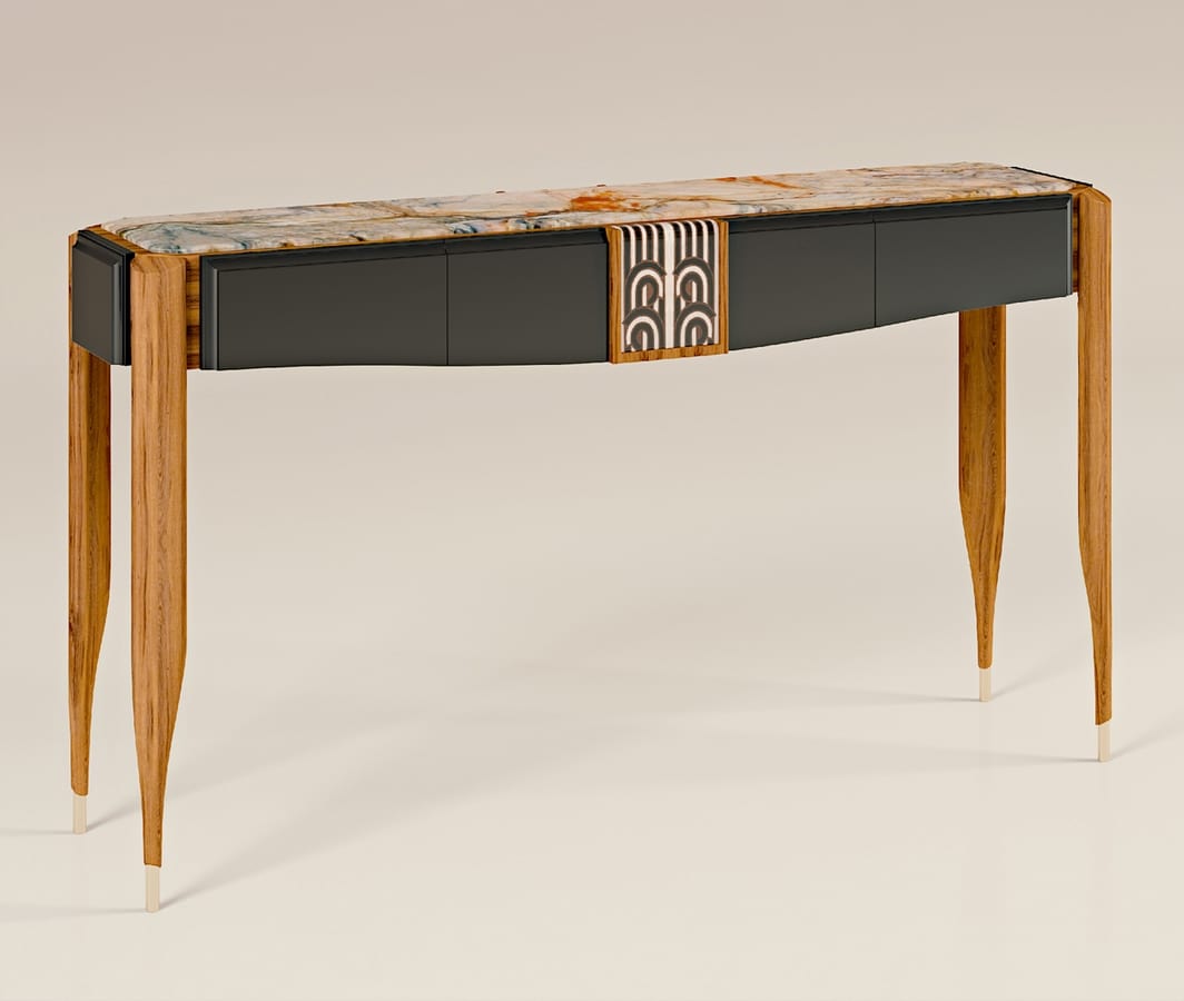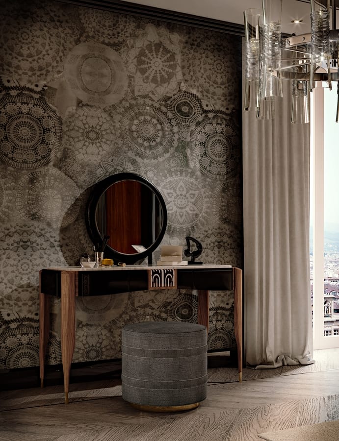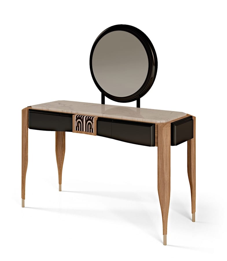 La camera da letto si compone anche di accessori di lusso ed eleganza. La consolle trucco completa di specchio da un tocco di femminilità alla camera, la struttura dalla linea diritta è ammorbidita dall'intarsio arrotondato dei legni policromi, riprendono la linea curva del'intarsio la specchiera ed il pouf interamente rivestito in nabuk.
