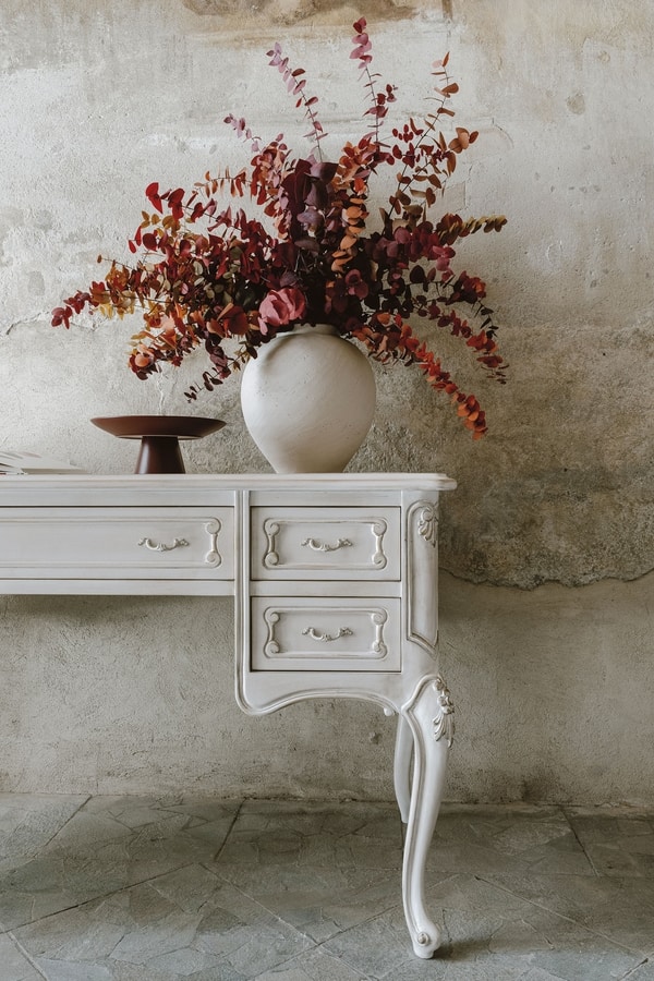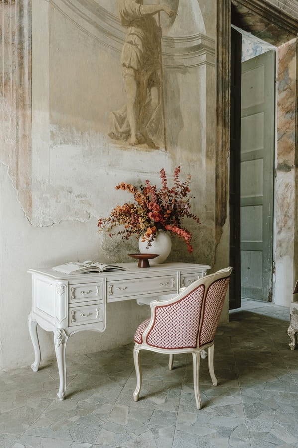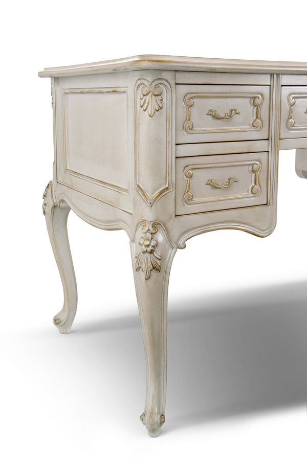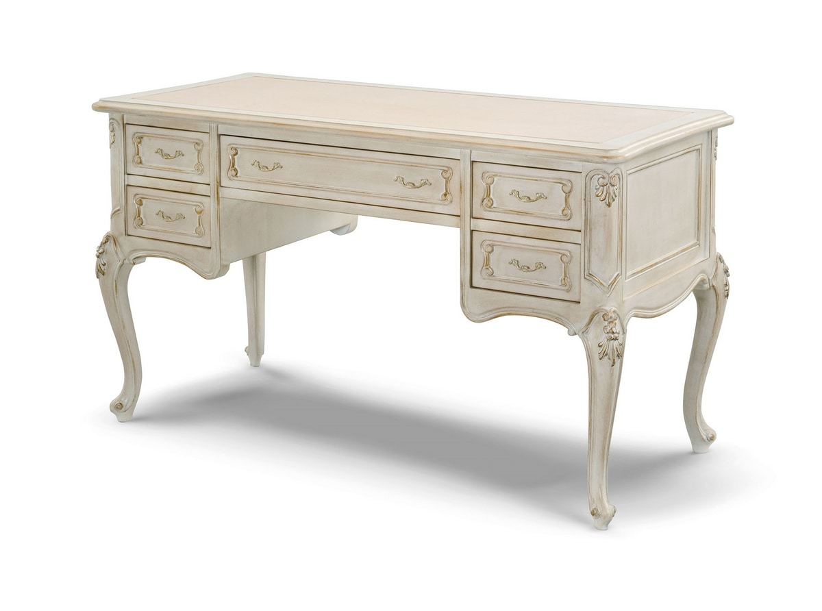 Scrittoio con piano in legno con inserto in pelle, finitura LAFM laccato spelato tempera francese colore bianco meringa fondo oro foglia