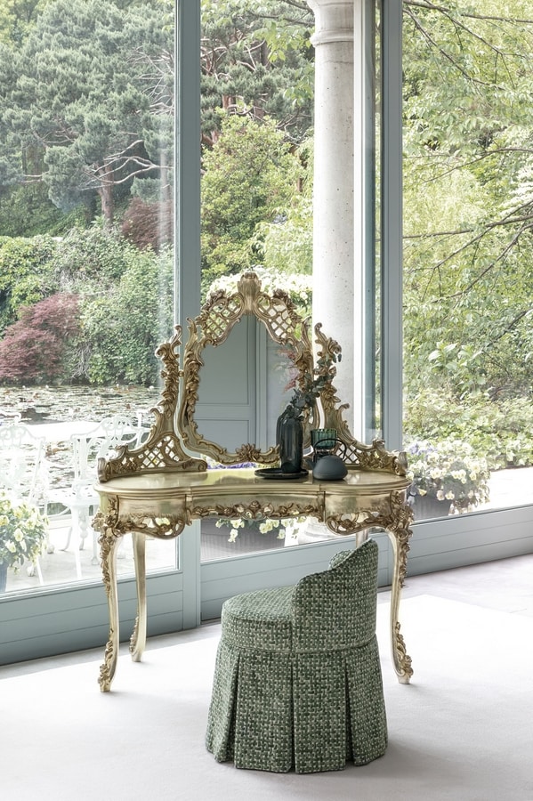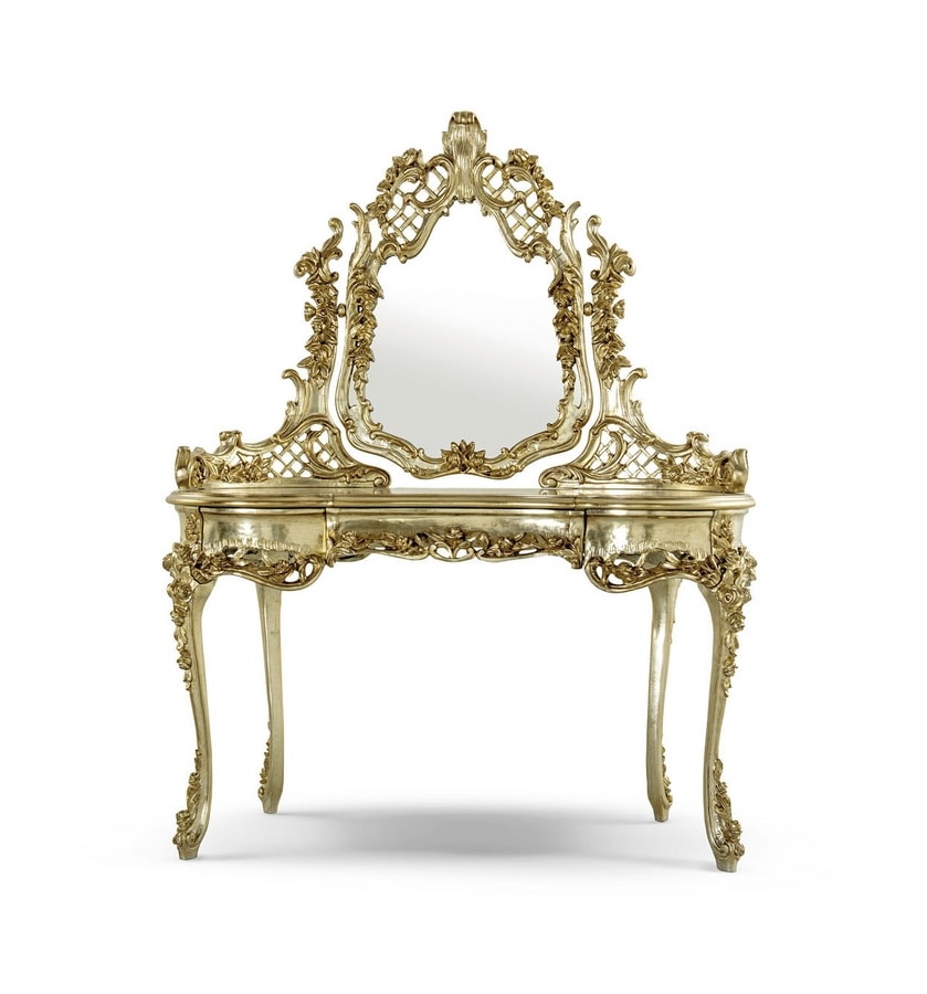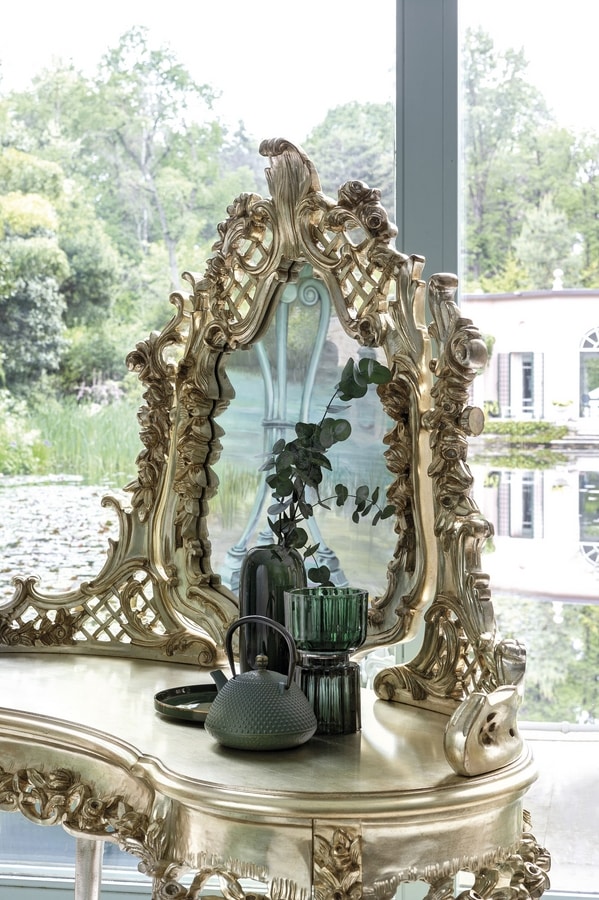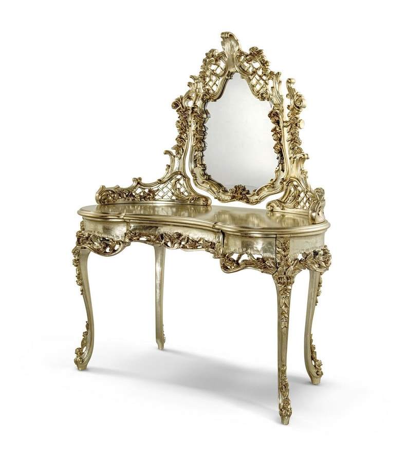 Toilette con specchiera intagliata in legno, finitura a foglia Silver Gold.