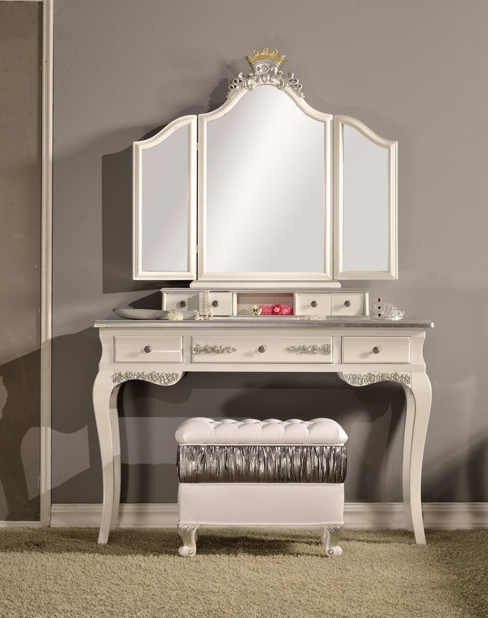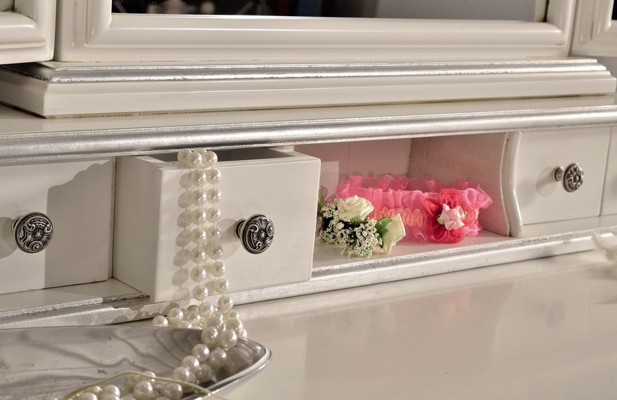 Toilette in stile classico. Realizzata in legno, finitura laccata, con intagli decorativi finitura foglia argento.