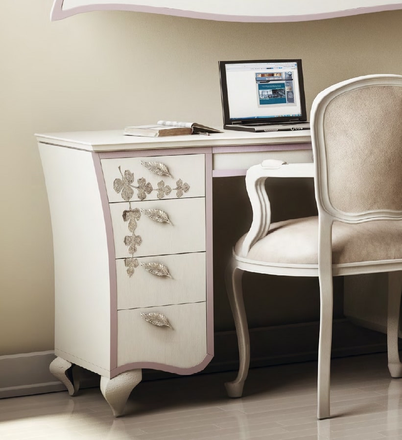 Scrittoio toilette in stile classico. Struttura in legno, con decorazioni floreali e maniglie argento. Dotato di 9 cassetti.