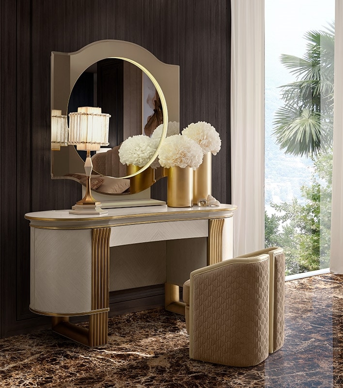 Toilette con struttura in multistrato ed MDF impiallacciato. Cassetto dotato di guide blum. Ripiani vetro. Profilo in metallo. Essenza eucalipto frisé bianco.