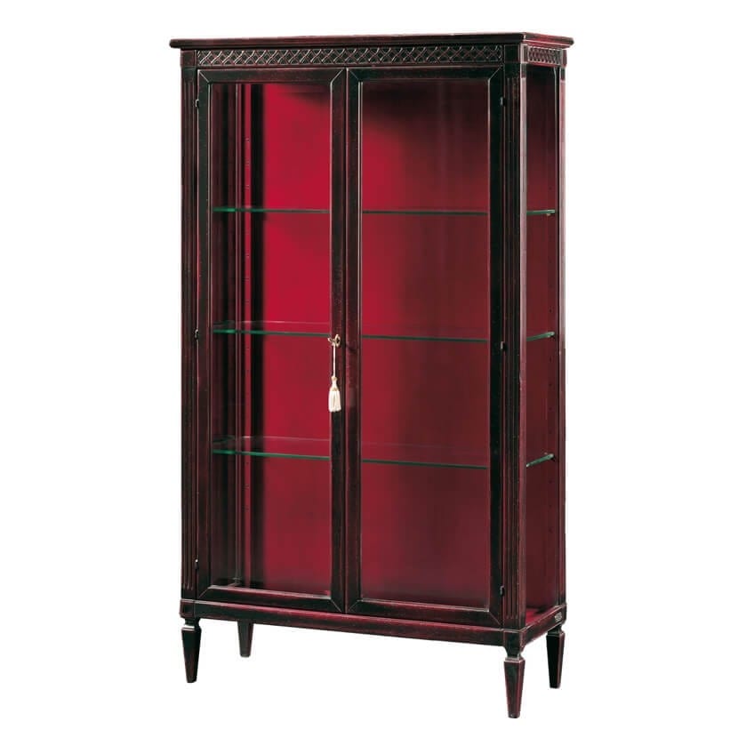 Vetrinetta in tiglio con due ante battenti a telaio con vetro e serratura, fianchi e ripiani interni in vetro, schienale in legno. Piano con top a ribalta a bacheca arricchito da una fascia sotto top intagliata con motivo geometrico che si ripete sui fianchi e gambette a spillo con gola sormontate da spalle decorate a canna di fucile. Rosette intagliate sulle sommità su richiesta. Nella foto, legno tinto rosso ebanizzato (codice: Nero) ed interni laccati rosso (codice: Rosso Faber).