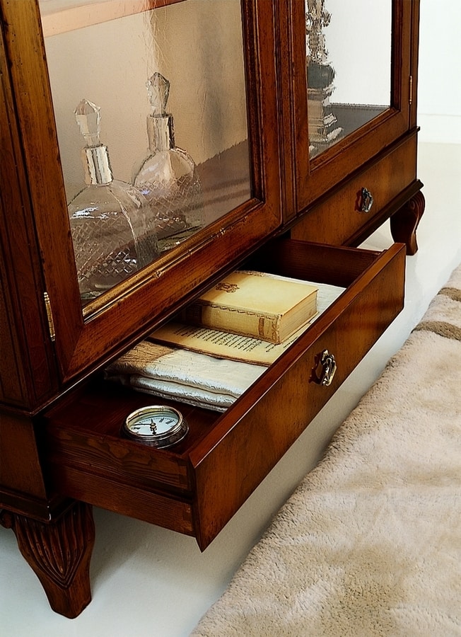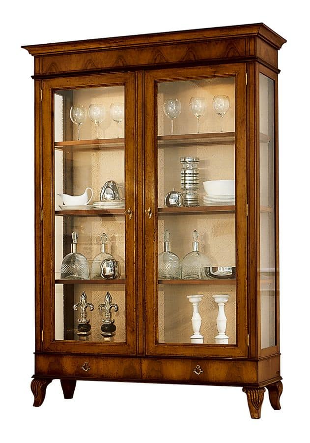 Vetrina in noce a due porte e due cassetti. Architrave modanato con fascia in piuma di noce, fascia inferiore con due cassetti e gambe intagliate. All'interno, schienale in tessuto con tre ripiani in cristallo su telaio di legno.