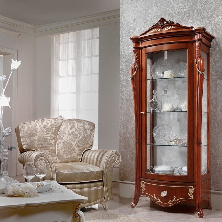 Vetrina ad 1 anta, in stile classico, con struttura in legno, con decori artigianali. Ripiani interni in vetro.