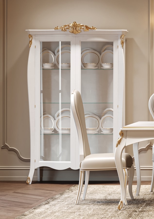 Vetrina a 2 ante, con corona decorativa finitura oro. Schienale in legno.