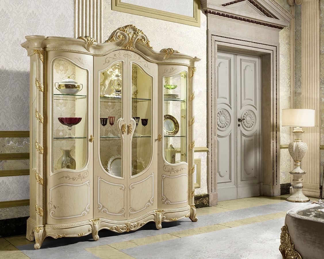 Vetrina a 4 ante, con schienale rivestito in tessuto.
