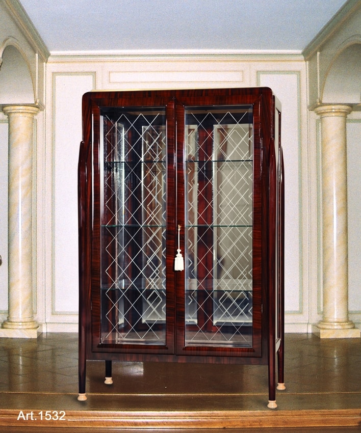 Vetrina a 2 ante in legno palissandro e acero, cristalli molati e incisi, lucidatura "brillante".