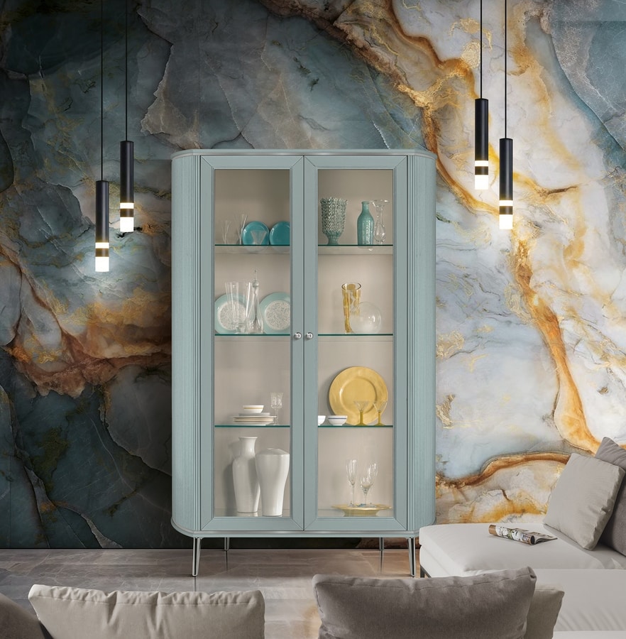 Vetrina a 2 porte con chiusura ammortizzata, decoro millerighe. Finitura laccata.