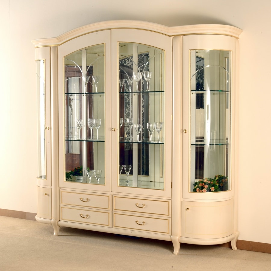 Vetrina con 4 ante e 4 cassetti. Cristalli molati ed incisi. Struttura in legno finitura laccata avorio patinato, con filetti decorati a mano.
