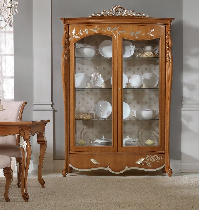 Vetrina in legno noce miele, con decori floreali. Ripiani interni in vetro.