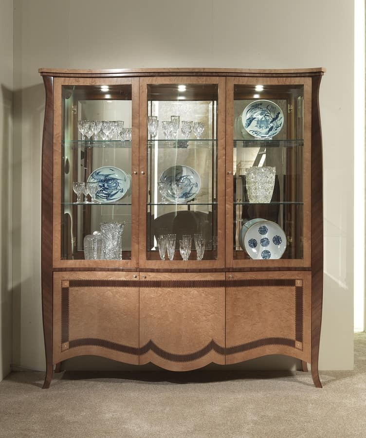 Vetrinetta “Charme” in legno intarsiato, con 3 porte in vetro trasparente e 3 porte in legno, realizzata in stile classico di lusso, per uso alberghiero e residenziale.