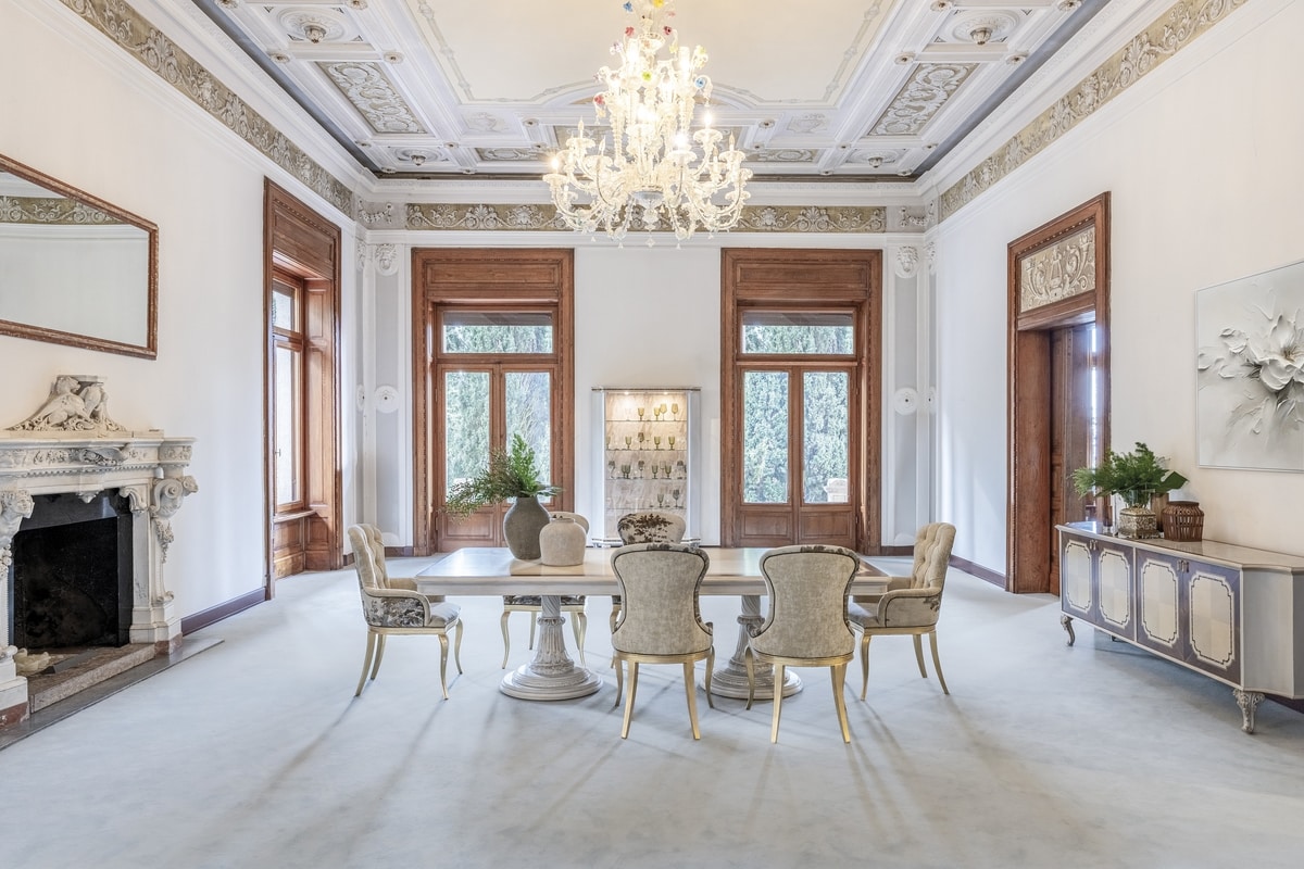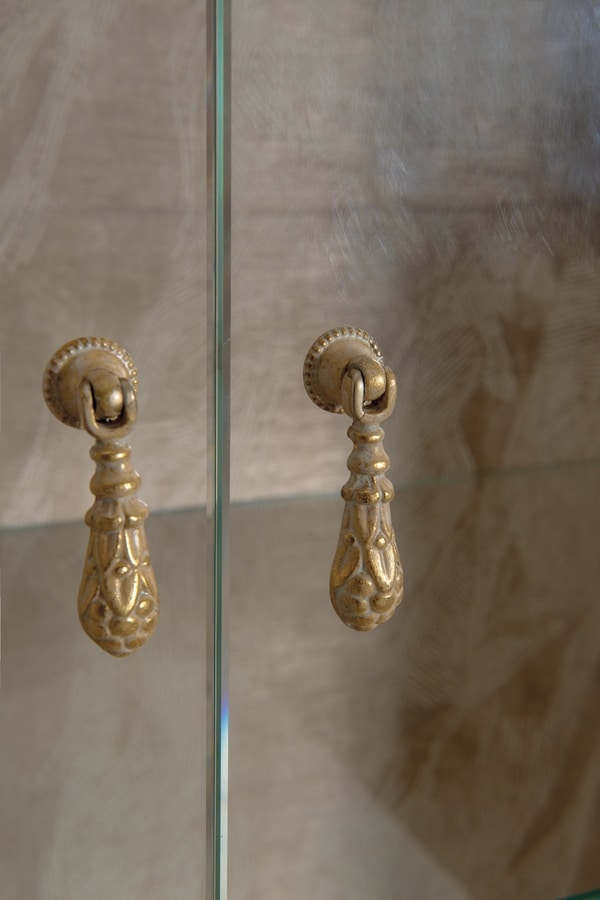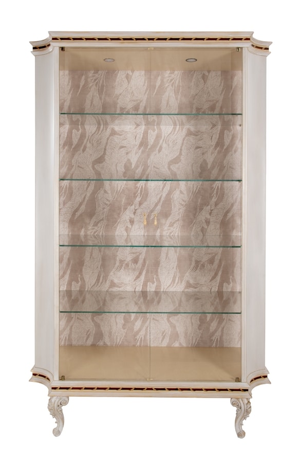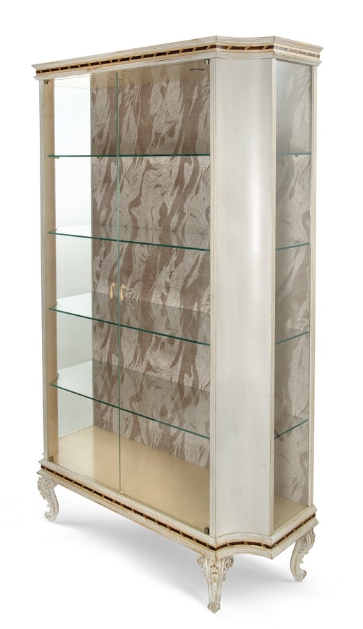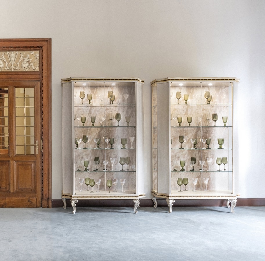 Elegante vetrina con 2 ante in vetro e struttura laccata a tempera francese bianco meringa con fondo in foglia oro, secondo la finitura LAFM. Le gambe, finemente scolpite, sorreggono una composizione armoniosa arricchita da raffinati intarsi su fondo in erable, con filetto decorativo in palissandro e pero sfumato. All’interno, 4 mensole in vetro.